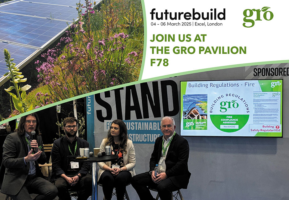 With Futurebuild partnering with the Supply Chain Sustainability School this year, sustainability and green infrastructure are continuing to be a key topic. Which is why GRO are delighted to announce that, after the incredible success of the GRO Pavilion over the past 2 years, Futurebuild 2025 on the 4th-6th March will see a return of the bustling hub. GRO Pavilion 2025 (stand F78) will be occupied by member companies Geoshield, LRWA (Liquid Roofing and Waterproofing Association), Optigrun, Ravago, SIKA, and Wraxalls. It will offer a central point for all looking to learn more about green, blue and BioSolar roofing.